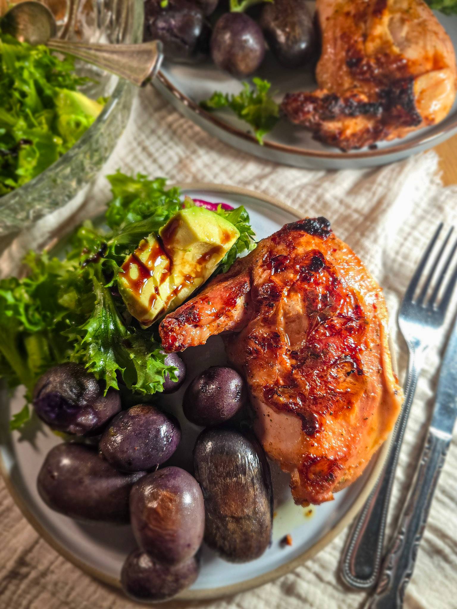 Chicken supreme was on the weeknight dinner menu this week since my local butcher remembered to display some, so I quickly marinated the chicken pieces for grilling (you can also roast these). I served it with a crunchy green salad (avocado & balsamic glaze) and a tray of purple potatoes we grew in bags in the garden and finally harvested. They’re earthy, just a little sweet and feel wildly exciting considering they started in a compost bag haphazardly squeezed in my flower beds.